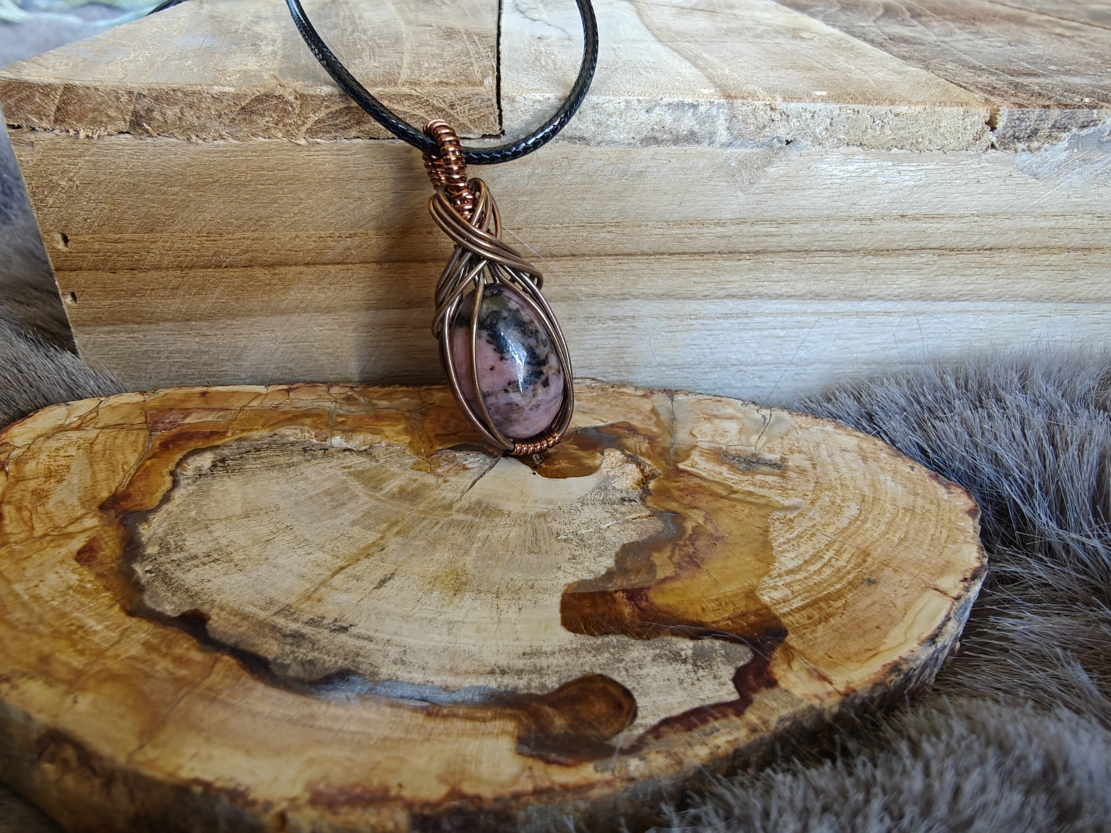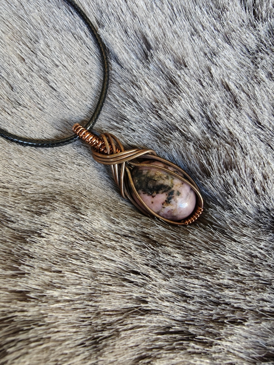 Handgemaakte wire wrap mini Rhodoniet met geoxideerde koperdraad