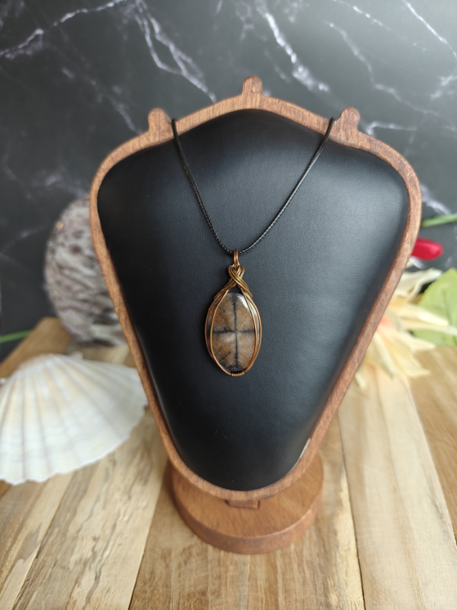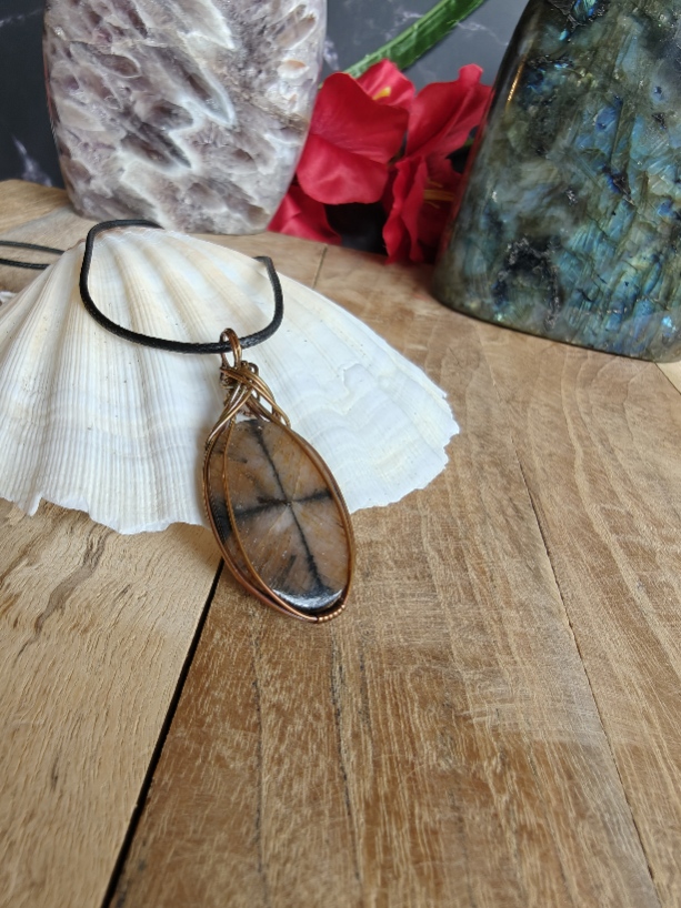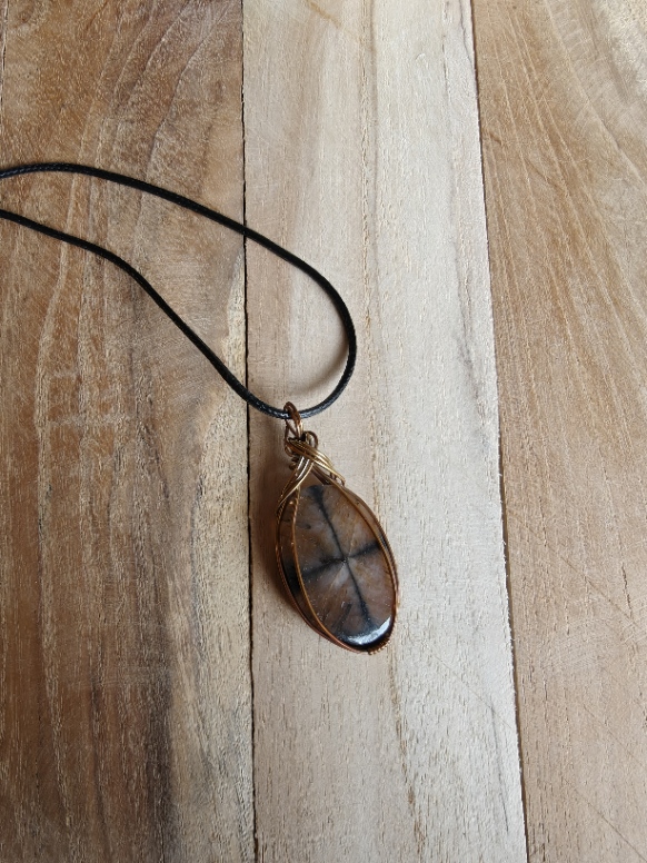 Handgemaakte wire wrap van Chiastoliet met geoxideerde koperdraad
