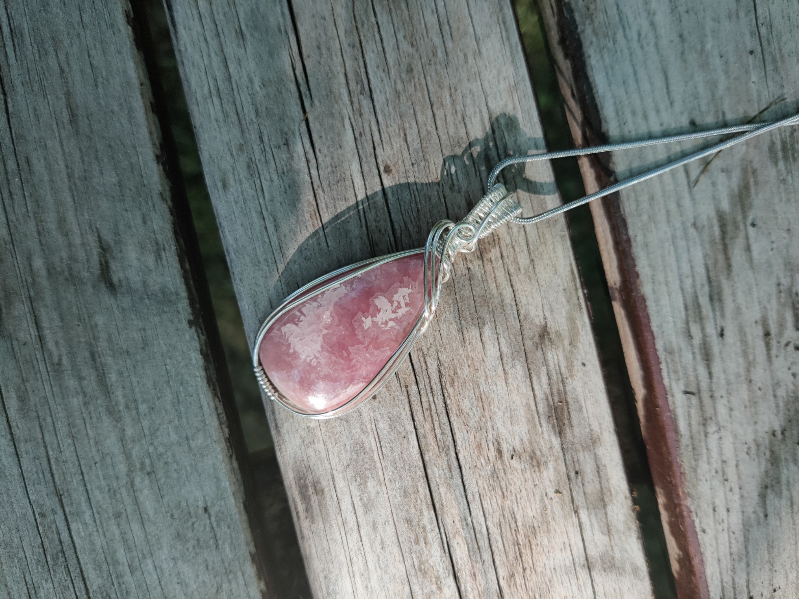 Handgemaakte wire wrap van Rhodochrosiet met verzilverde koperdraad