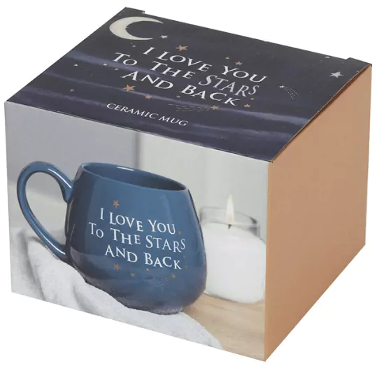 I love you to the stars and back! Van deze liefdevolle mok word je vanzelf vrolijk. De beker is uitgevoerd in blauw met goudkleurige sterren en een groot oor. Geef hem cadeau aan je moeder tijdens moederdag, of aan een goede vriend(in) als vriendschapsgeschenk. Of aan je geliefde natuurlijk!Â